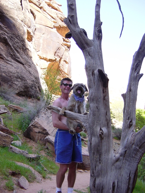 At the beginning of our second week in Moab , Hooligan still had a high temperature. We decided to stay a few more days. We went hiking with the dogs and Ian took the chance to teach Sniff how to climb trees ... what a good Dad.