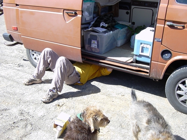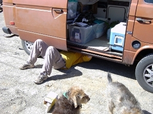 With Hooligan better , the bus decided it was time to be sick. Finnigan supervised Ian while he replaced the fuel filter ...